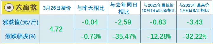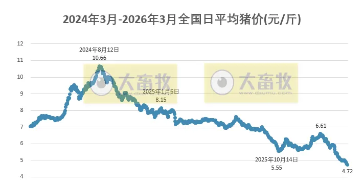 大畜牧小编根据我国27省的猪价数据,计算出2026年3月26日全国平均猪价为每斤4.72元,比昨天下跌0.04元,跌幅为0.73%,跌幅小幅收窄,连续7天下跌,累计下跌0.28元,不仅继续创下今年以来最低,也继续创下至少是2019年以来的新低;