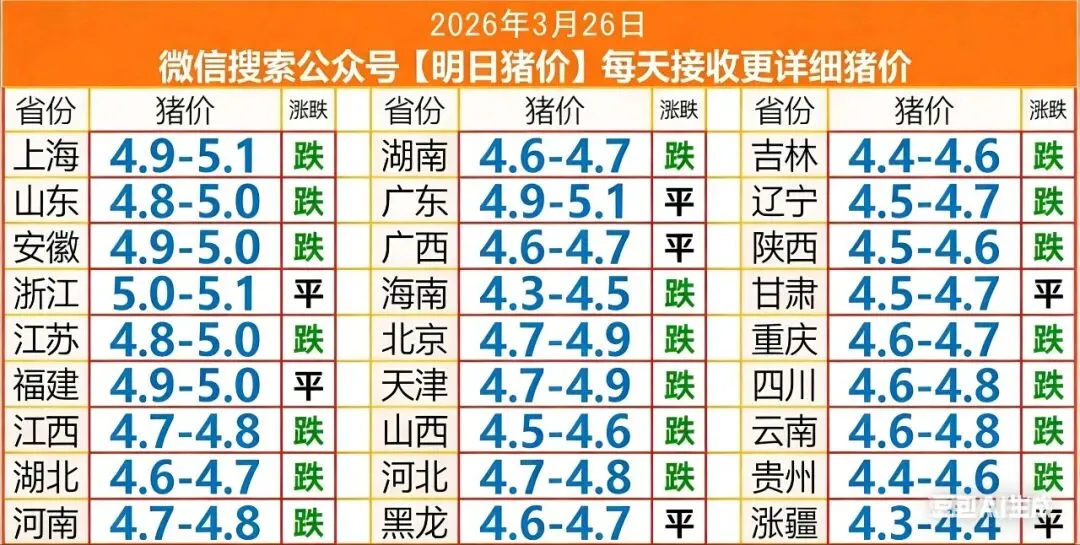 明天猪价2026.3.26明日猪价! 养羊网 2026-03-26 明天猪价2026.3.26明日猪价!先赞后看养成习惯,创作不易麻烦点个赞支持一下!谢谢您!【老鼠药】特效老鼠药, 一只沾上一窝死亡,正规手续 彻底消灭老鼠! 养羊网 2026-03-26 上一篇:猪价跌入万丈深渊?跌破10元大关创近15年新低,行情让人绝望! 下一篇:5元保卫战失守!2026猪价跌穿成本底线,国家的这步棋你看懂了吗? 您可能还会对下面的文章感兴趣111: 相关文章 谁在操控咱们的猪价?4股力量说了算,养殖户看完心里透亮! 近期价格更新!!! 水产批发市场鱼虾蟹价格行情最新报价表查询 2026年01月24日东莞大岭山鸡蛋价格早报