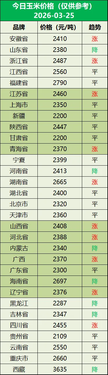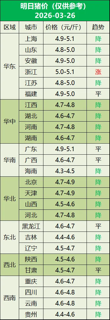 明日猪价(2026年03月26日) 养羊网 2026-03-26 明日猪价(2026年03月26日) 养羊网 2026-03-26 上一篇:3月25日全国26省猪价“入4”【菲力奶—出生即可饲喂的乳猪配方奶粉】 下一篇:进入3月下旬,猪价一直在掉 您可能还会对下面的文章感兴趣111: 相关文章 2025年4月13日全国各地生猪价格信息 鸡蛋价格一览|2026年3月11日鸡蛋价格(明日早知道) 敦煌,一定要去吃这家手抓羊? 2025年4月13日全国各地生猪价格信息
