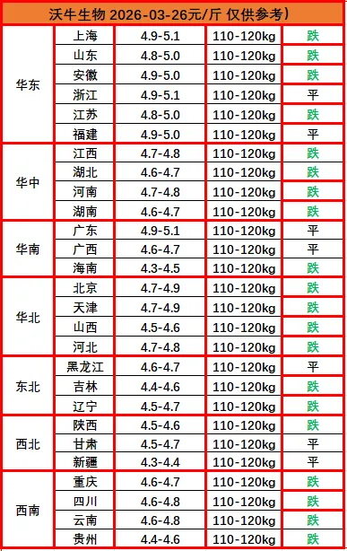 ? ?猪价播报沃小牛,助力养猪牛牛牛!各位养猪的老铁们,大家好!我是沃小牛,明天是2026年03月26日,最新猪价已经出来了:全国生猪价格延续低位弱势震荡,整体呈“主销区企稳、主产区微跌、全面低于5.0元/斤”态势。区域分化明显:华东、华南主销区依托消费支撑,维持4.8-5.0元/斤,福建、安徽持平;华中、华北主产区普遍下跌,跌至4.5-4.8元/斤;东北、西北低价区持续探底,新疆4.3-4.4元/斤为全国最低。全市场无省份上涨,仅少数区域持平,供应过剩与需求疲软叠加,养殖端全面陷入深度亏损,行业磨底特征显著。