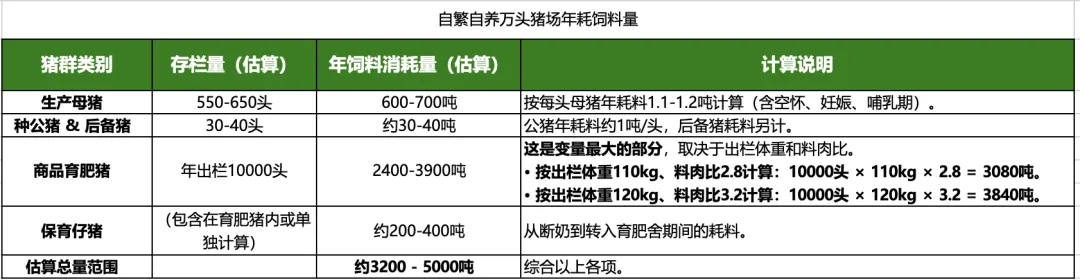 ③ 商品育肥猪(全程):年消耗约2300~4100吨(取决于料肉比和出栏体重)
