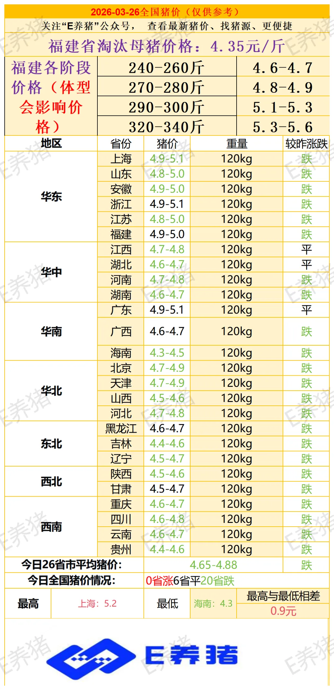 2026年3月26日猪价(绿的心慌)每日新增淘汰母猪价格、福建区域各阶段肥