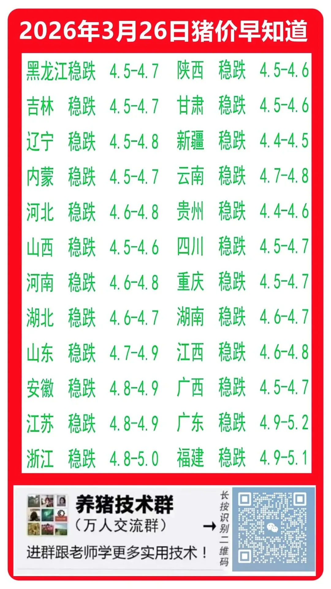 加速下跌!!2026年3月26日全国猪价一片绿!! 养羊网 2026-03-26 加速下跌!!2026年3月26日全国猪价一片绿!! 养羊网 2026-03-26 上一篇:【明日猪价】3.26全国最新猪价 下一篇:3月26日鸡蛋价格 您可能还会对下面的文章感兴趣111: 相关文章 张记烤羊腿,北京最好吃的烤羊腿! 统贺饲料│(2026.1.25)明日猪价早知道 2025年4月13日全国各地生猪价格信息 2025年4月13日全国各地生猪价格信息