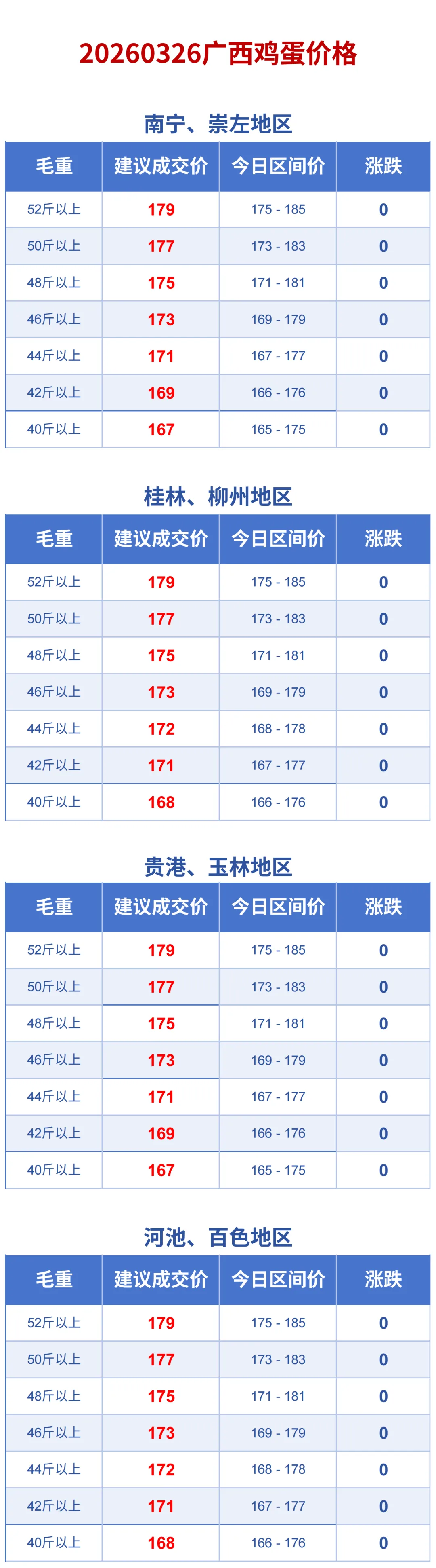 说明:广西鸡蛋价格发布,是为深入落实农业农村部《“百场(厂)千村万户”畜禽生产和效益定点监测信息采集》工作要求的基础上,健全广西蛋禽产业数据监测体系,提供实时精准的鸡蛋价格锚点,推动行业形成透明规范、公允合理的价格体系,助力我区蛋禽产业高质量发展。