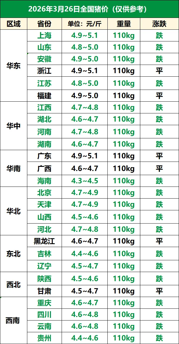 3月26日全国猪价跌惨!下跌“一塌糊涂”! 养羊网 2026-03-26 3月26日全国猪价跌惨!下跌“一塌糊涂”! 养羊网 2026-03-26 上一篇:2026年3月25日 鸡蛋价格, 最新蛋价行情! 下一篇:【猪价早报】2026. 3 . 26全国猪价! 您可能还会对下面的文章感兴趣111: 相关文章 近期价格更新!!! 广州生猪源头批发 【明天猪价】1月12日全国猪价( 涨涨涨) 2025年4月13日全国各地生猪价格信息