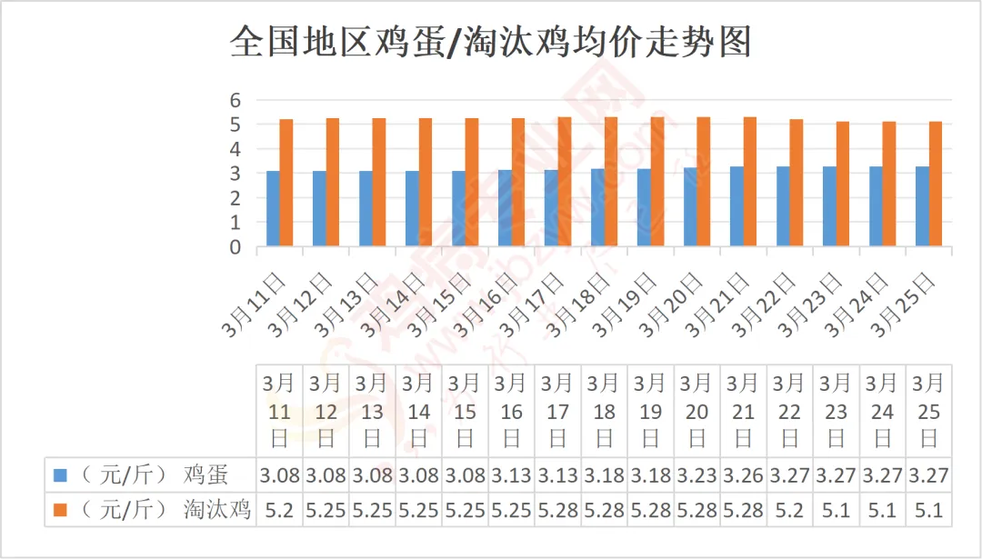山东地区:菏泽红蛋散筐大码3.17-3.2元/斤,与昨日相比持平,淘汰鸡5.4元/斤;