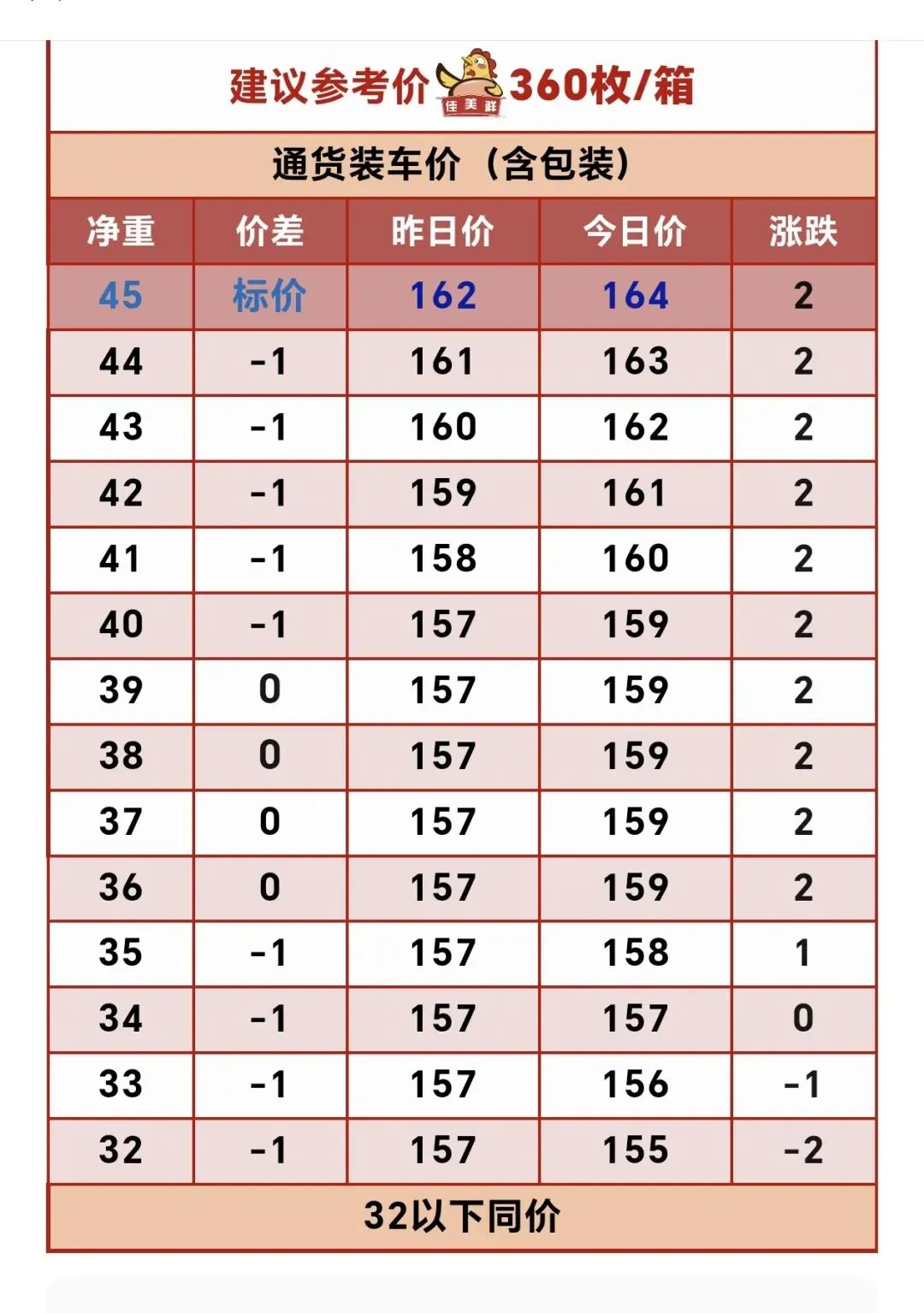 湖北浠水粉蛋价格涨4,45斤粉蛋含箱蛋点收购165元每箱,45-43斤,轻1斤减2元每箱,42斤159元涨4,42-38斤,轻1斤减2元每箱,38-33轻1斤,减3元每箱,360枚纸箱装。
