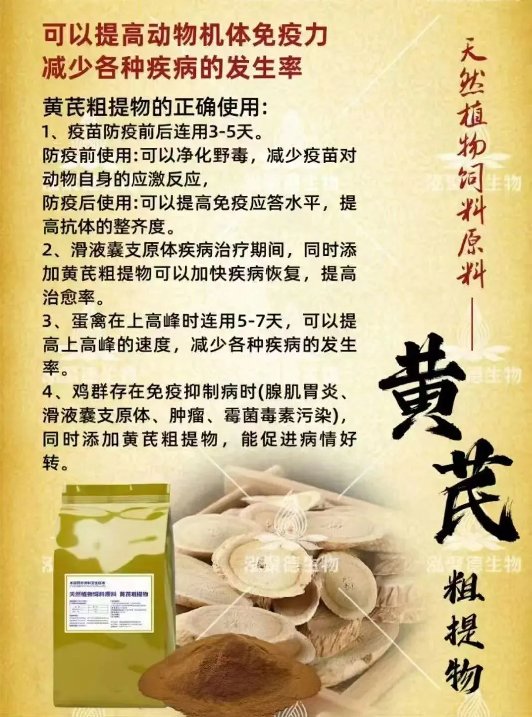 春季在鸡群中合理使用黄芪,核心是利用它补气固表、增强免疫、抗应激的特点,非常契合春季温差大、易感冒、呼吸道多发、鸡群应激多的养殖特点,具体效果和用法很明确: