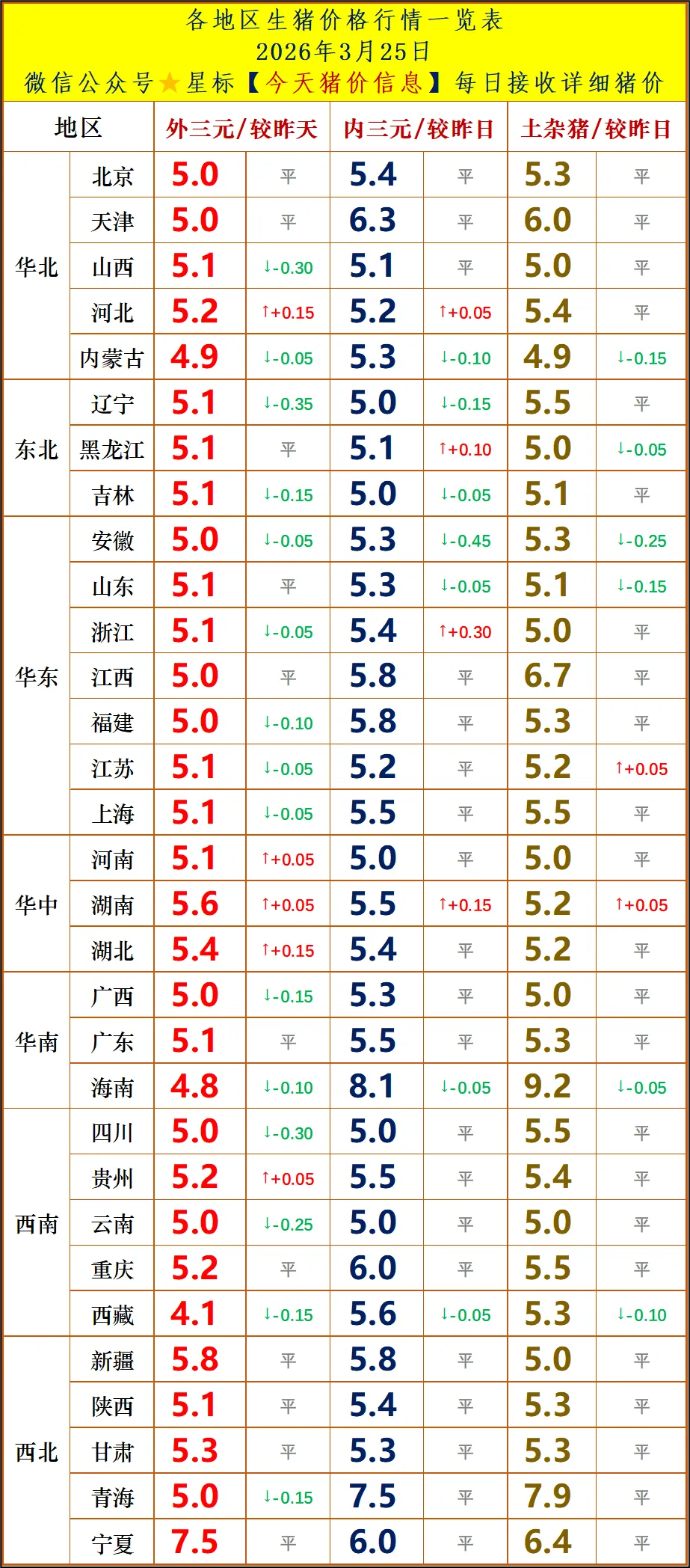 今日猪价 | 2026.3.26明天猪价行情分析!2026年03月25日猪价行情:全国综合均价4.96元/斤 外三元:5.08元/斤,较昨日下跌0.01元 内三元:5.14元/斤,较昨日下跌0.06元 土杂猪:5.15元/斤,较昨日下跌0.02元