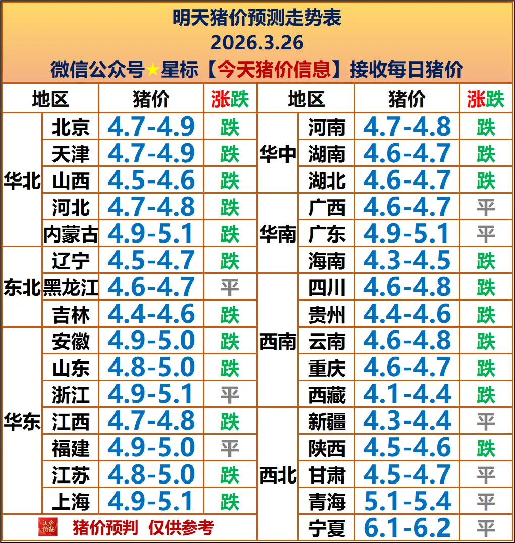 明天3 月 26 日全国猪价偏弱下行,主流 4.4-5.1 元 / 斤,北方产区低位盘整,华东普跌,市场仍处底部震荡。终端需求清淡,暂无明显波动,整体购销偏弱。