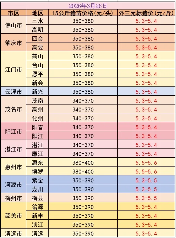3月26日猪价速递 养羊网 2026-03-26 3月26日猪价速递广东猪苗报340~400元,毛猪报5.3~5.6元,全省各地区价格微升0.1元。(行情仅供参考) 养羊网 2026-03-26 上一篇:又跌!2026年3月26日-今日最新猪价行情 下一篇:3月26日今日猪价牛价小麦价玉米价大米价 您可能还会对下面的文章感兴趣111: 相关文章 这个物价在东莞,合理吗…… 2025年11月16日穗虔优农水果批发价格 ?京东3毛抢鸡蛋??手慢无! 2025年4月13日全国各地生猪价格信息