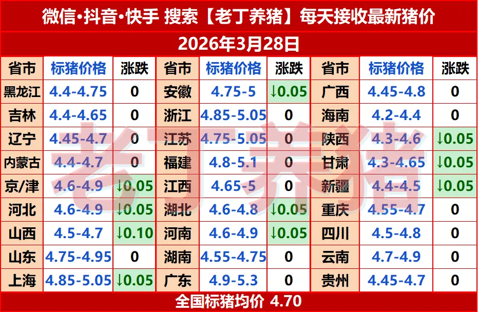 猪价有变!【明天猪价】3月28日全国猪价涨跌表! 养羊网 2026-03-27 猪价有变!【明天猪价】3月28日全国猪价涨跌表!看完点亮“红心”支持老丁 养羊网 2026-03-27 上一篇:近七年新低,猪价跌至每斤5块多,专家:短期内猪价仍将承压运行,下半年有望好转 下一篇:2026年3月27日全国各地最新猪价行情!两点红! 您可能还会对下面的文章感兴趣111: 相关文章 2025年4月13日全国各地生猪价格信息 杀羊啦 乡里的土鸡卖不完根本卖不完 3月21日各地鸡蛋价格详情
