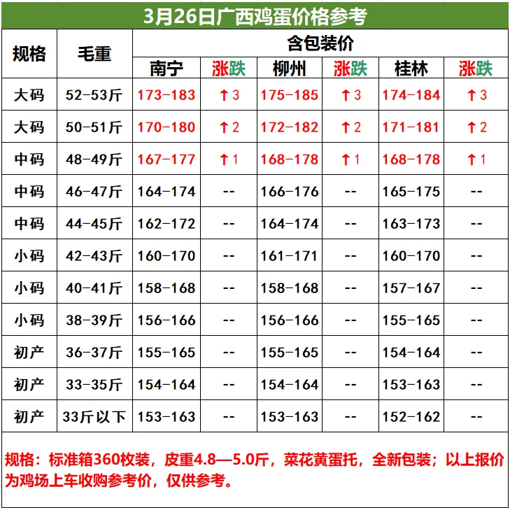 3月26日桂林、柳州、南宁鸡蛋价格参考