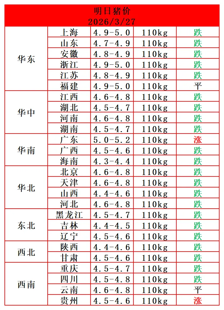 猪价继续探底!2026.03.27鼎王猪价播报早知道! 养羊网 2026-03-27 猪价继续探底!2026.03.27鼎王猪价播报早知道!立马收到明天最新猪价鼎王金猪就是长得快!订购电话:13980400130 养羊网 2026-03-27 上一篇:2026.3.27-伞猪明日猪价-回调! 下一篇:3月27日 全国猪价早知道! 您可能还会对下面的文章感兴趣111: 相关文章 2025年4月13日全国各地生猪价格信息 美国鸡蛋价格?这么贵! 河北景县:野菜深加工效益高 近期价格更新!!!
