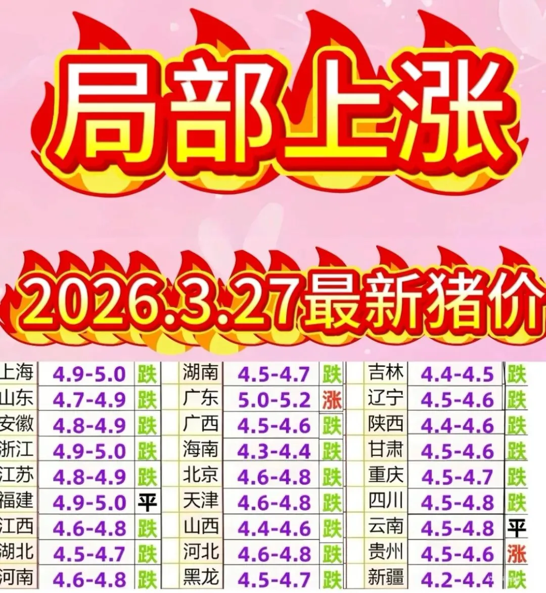 局部上涨!2026年3月27日最新猪价 养羊网 2026-03-27 局部上涨!2026年3月27日最新猪价 养羊网 2026-03-27 上一篇:2026-03-27今日猪价 下一篇:(3月27日)最新鸡蛋价格预报!更新中 您可能还会对下面的文章感兴趣111: 相关文章 我要曝光学校! 天气热起来了,少薅点,吃不完 猪价呈现稳中偏弱,生猪价格继续弱势 全国各地2026.1.26~明日最新猪价(猪价已更新!)