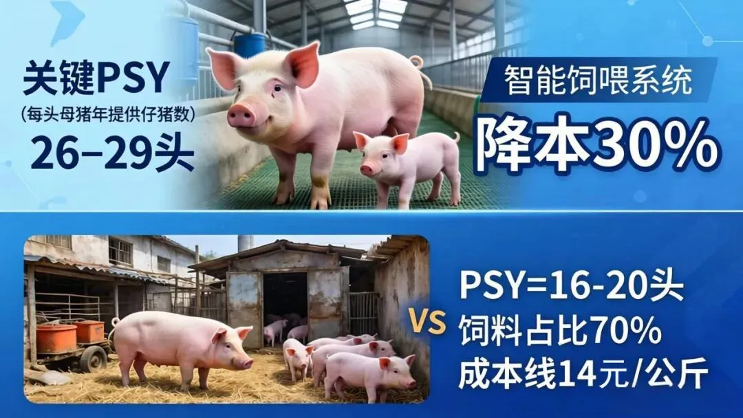 成本控制,首看PSY(Pigs Weaned per Sow per Year)?:每头母猪每年提供的断奶仔猪数,是衡量猪场繁殖效率与生产效益的核心指标。规模企业达26–29头,料肉比<2.5,智能饲喂降本30%。中小散户一般为?16–20头,成本线突破14元/公斤,饲料占70%,无议价权。