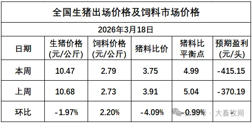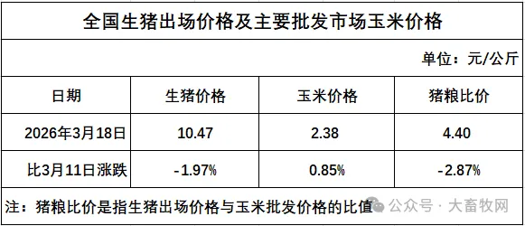 发改委价格监测中心发布2026年3月第3周猪粮比及猪价分析情况,本周全国生猪价格为10.47元/公斤,环比下跌1.97%,连续7周环比下跌,连续4周创2019年以来最低价;玉米价格为2.38元/公斤,环比上涨0.85%,连续2周环比上涨,涨至近半年最高价;猪粮比价为4.40,环比下降 2.87%,连续7周环比下降,创下2019年以来新低。