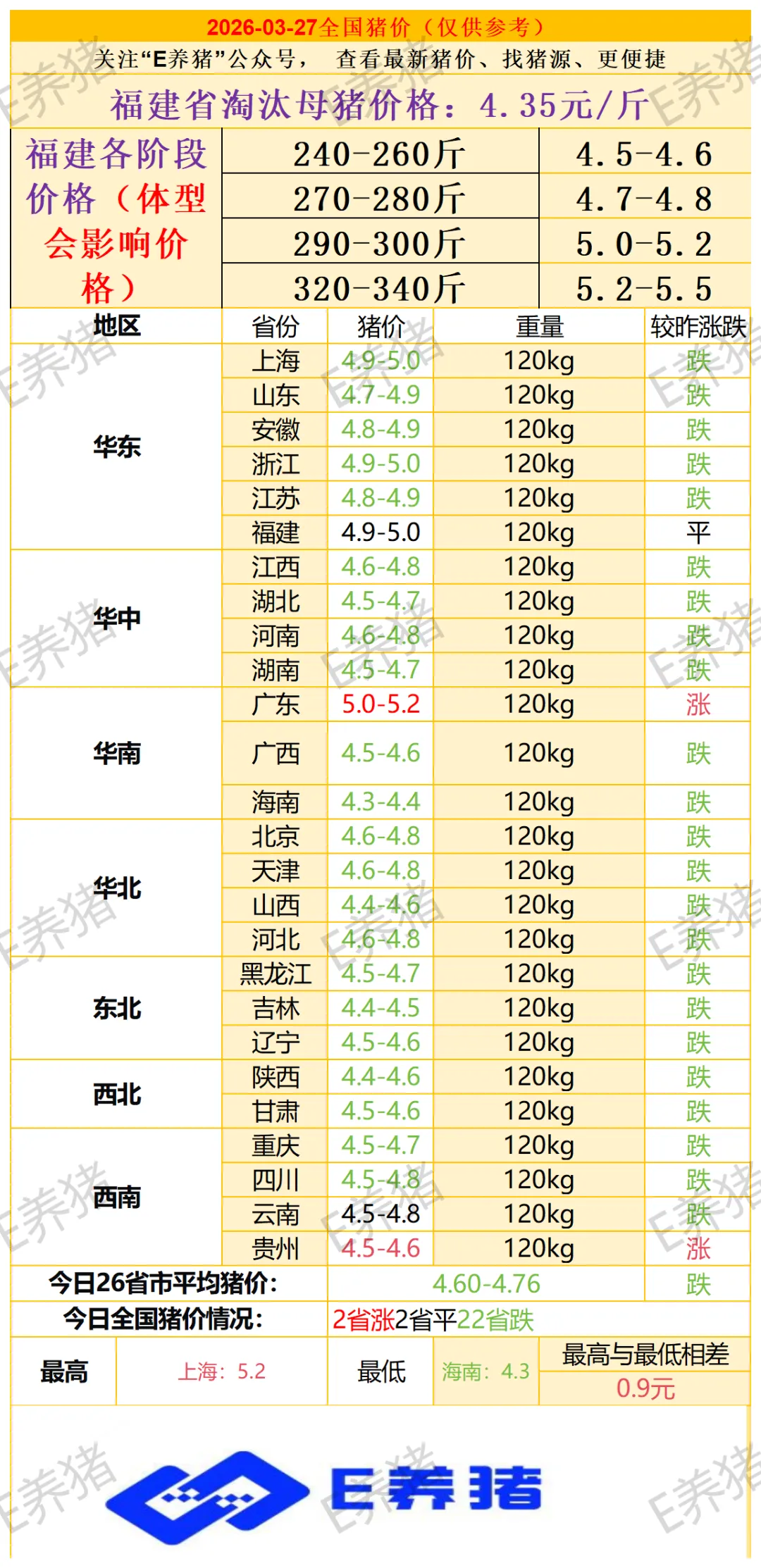 2026年3月27日猪价(绿中带红)每日新增淘汰母猪价格、福建区域各阶段肥