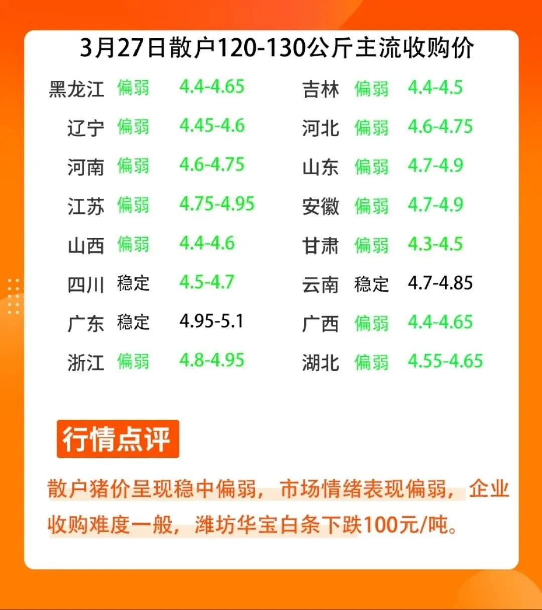 3月26日晚间猪价信息,今晚猪价情绪表现偏弱,屠宰企业采购难度一般偏弱,今晚白条猪价呈现稳中伴跌,潍坊华宝白条出场价格下跌100元/吨,东北牧原、山东牧原、河南牧原、江苏牧原、安徽牧原白条出场价格下跌100元/吨,预计明日北方集团猪价呈现偏弱,南方地区集团猪价呈现稳中有弱,重点关注集团猪场上猪上市量。