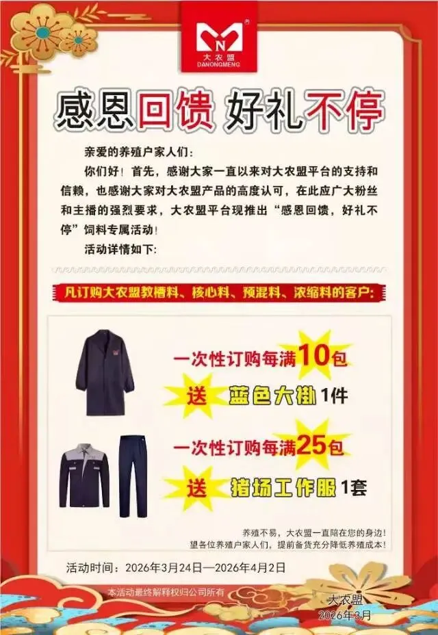 一次性订购每满25包送猪场工作服1套
