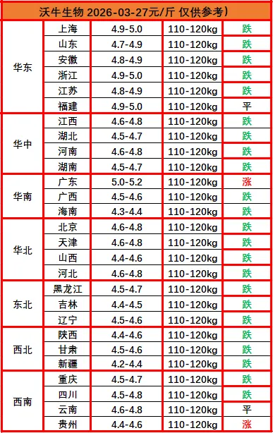 ? ?猪价播报沃小牛,助力养猪牛牛牛!各位养猪的老铁们,大家好!我是沃小牛,明天是2026年03月27日,最新猪价已经出来了:久违了的两个红点:广东和贵州。明日全国猪价整体延续普跌态势,仅广东、贵州小幅上涨,福建、云南持平,其余26个省份全面下跌,市场情绪极度低迷。价格区间集中在4.2–5.2元/斤,新疆最低至4.2元/斤,广东最高为5.0–5.2元/斤,多数省份价格在4.5–4.9元/斤区间徘徊。当前猪价已远低于行业平均成本线,自繁自养头均亏损持续扩大,行业现金流压力加剧。供给端产能去化缓慢,叠加消费淡季需求疲软,导致猪价持续探底。这一行情进一步印证了2026年行业“弱复苏、强分化”的判断,高成本、高负债养殖主体将面临更严峻的生存压力,也为行业结构性重组与国资介入创造了窗口期。
