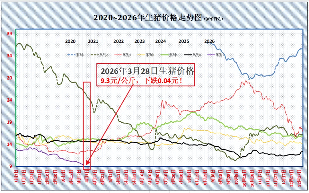 2026.3.28-明天猪价(跌冒烟了,猪价下跌“猛抬头”!)3月即将收官,国内生猪市场,自春节假期后,随着气温回升,生猪育肥上肉节奏加快,且,去年5-6月份母猪存栏处于高位,国内适重标猪供应充足,但是,季节性需求进入淡季,虽然,市场二育以及屠宰场分割入库对猪价有一定支撑,但是,整体来看,生猪市场仍处于“供需失衡”的阶段,市场悲观情绪弥漫,生猪市场陷入“越跌越猛”的魔咒! 据数据分析,元旦以来,国内生猪市场呈现“先强后弱”的局面,1月中上旬,受阶段性养殖端压栏挺价,肥猪价格偏强,市场控量情绪较高,猪价走势偏强,1月下旬前,标猪报价涨至13.16元/公斤,价格创下年内峰值!但是,1月末以来,猪价呈现“单边”下降的走势,春节假期也难以扭转市场供需错配的局面,截止目前,外三元标猪触底9.34元/公斤,猪价即将触底9元/公斤,生猪市场全面进入“4元时代”! 受猪价偏弱运行,饲料原粮方面玉米报价高位震荡,现阶段国内猪粮比跌破4:1,养殖陷入深度亏损阶段!截至本周,机构调研,自繁自养头均育肥亏损增加至310元/头,5.5~6月前补栏仔猪育肥亏损在200块钱左右,生猪市场面临超预期低迷的局面! 个人认为,猪价单边下降,主要受春节后供应水平增加,但是,需求进入季节性淡季,市场此消彼长下,产销失衡明显,导演此轮猪价快速下降的走势! 供应端,2月份,生猪有效出栏时间减少,集团猪企出栏计划偏多,主流头部猪企出栏计划完成较差,部分产能被动进入3月出栏通道,生猪出栏均重上升!且,3月份受10个月前母猪存栏止跌上涨,母猪生产效率大幅提升,部分头部猪企母猪PSY达到26~28头,全国平均值超23头,生猪供应能力进一步增加。 叠加,春节后,玉米行情持续走高,国际地缘局势恶化,豆粕价格也明显上涨,生猪育肥增重加快,饲料成本压力陡增,养殖端挺价惜售缺乏信心,产能呈现加快出清的局面,市场中小标猪供应大幅增加。 需求端,由于季节性需求淡季,市场白条购销冷清,内销以及城市刚需不足,屠宰场白条出货不畅,主流屠企被动入库增多!当然,由于标猪价格偏低,屠宰场入场分割入库现象增多,截至目前,样本屠宰场开工率在33.4%,冷冻猪肉库存增加至21.52%,环比增加2.8个百分点。不过,需求整体支撑有限,尤其是,二育入场情绪不高,市场对于猪价前景仍显悲观! 由此分析,在供需变化下,猪价延续下跌的走势,受屠宰场调价,预计,3月28日,标猪报价跌至9.3元/公斤,下降0.04元,后市关注生猪购销情绪的变化。