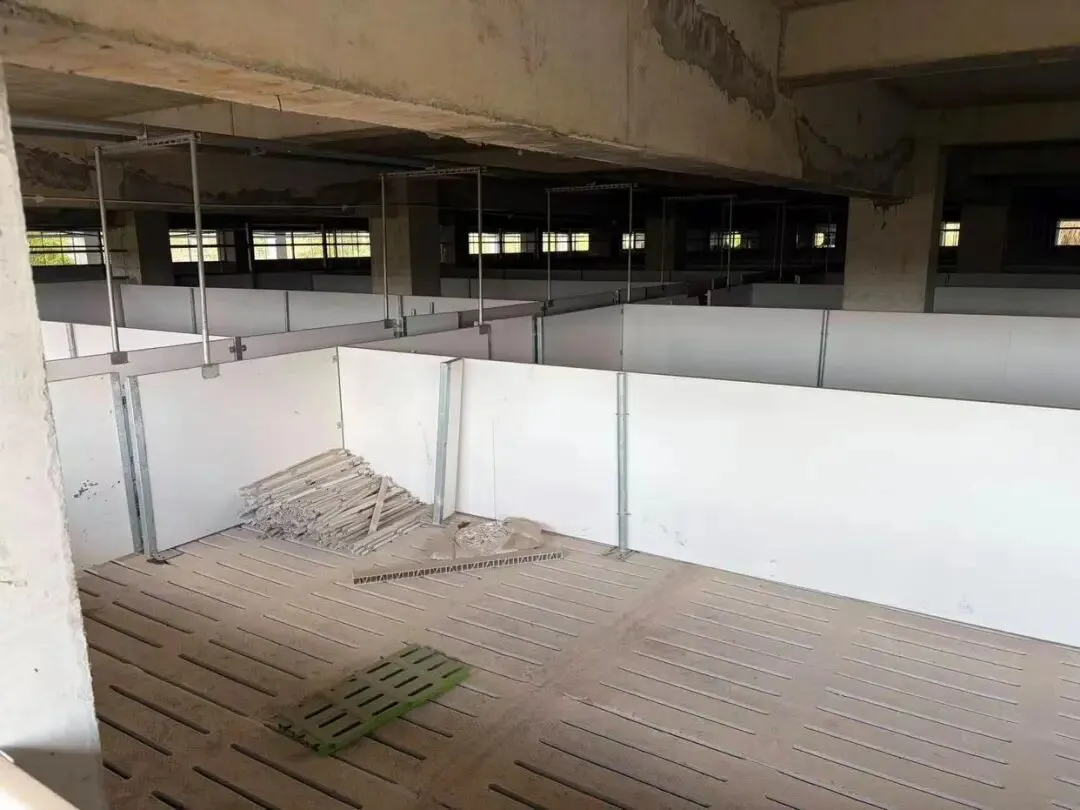 据了解,该栋主体建筑的楼顶原计划铺设瓦片,目前约一半未完成;一楼猪舍已完成漏缝地板和栏位安装,但环保设施、污水处理、风机、除臭等关键配套设施尚未完工。建设期间,正值钢房顶封顶、设备安装调试阶段,原投资方因资金问题停工。此后,该猪场经历两次司法拍卖,第一次按评估价降价30%,第二次再降20%,均无人报名竞拍。