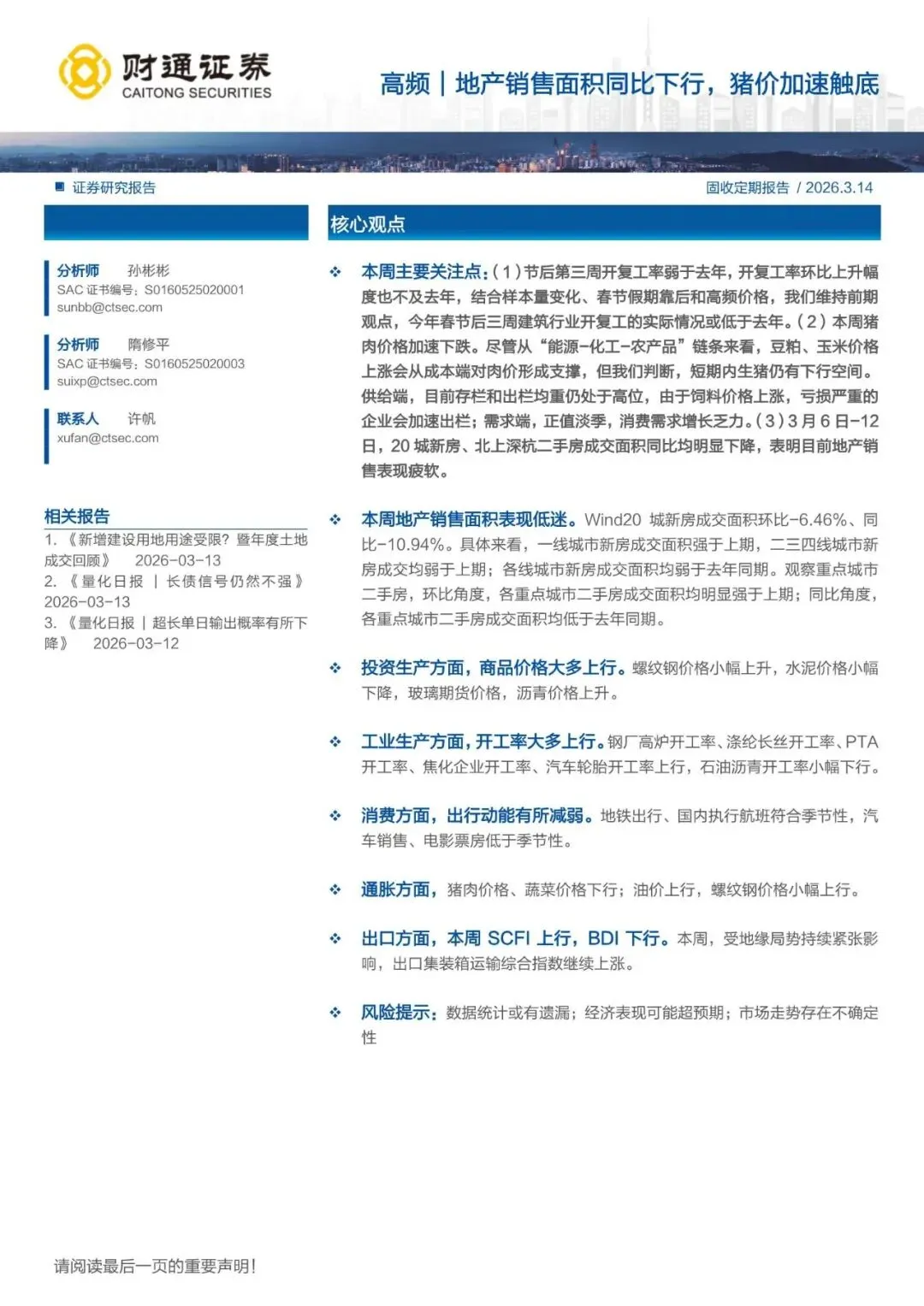 高频|地产销售面积同比下行,猪价加速触底-260314-财通证券-18页