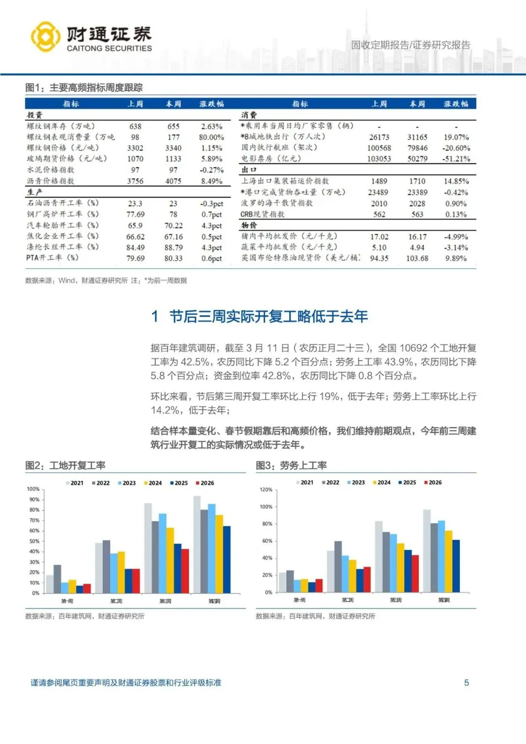 (1)节后第三周开复工率弱于去年,开复工率环比上升幅度也不及去年,结合样本量变化、春节假期靠后和高频价格,我们维持前期观点,今年春节后三周建筑行业开复工的实际情况或低于去年。
