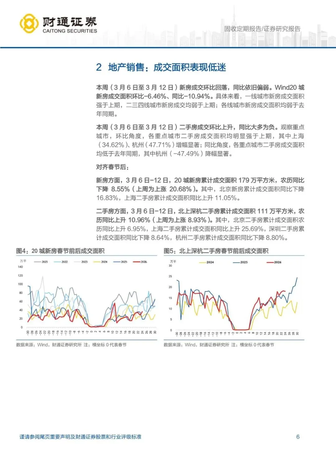 (3)3 月 6 日-12日,20 城新房、北上深杭二手房成交面积同比均明显下降,表明目前地产销售表现疲软。?
