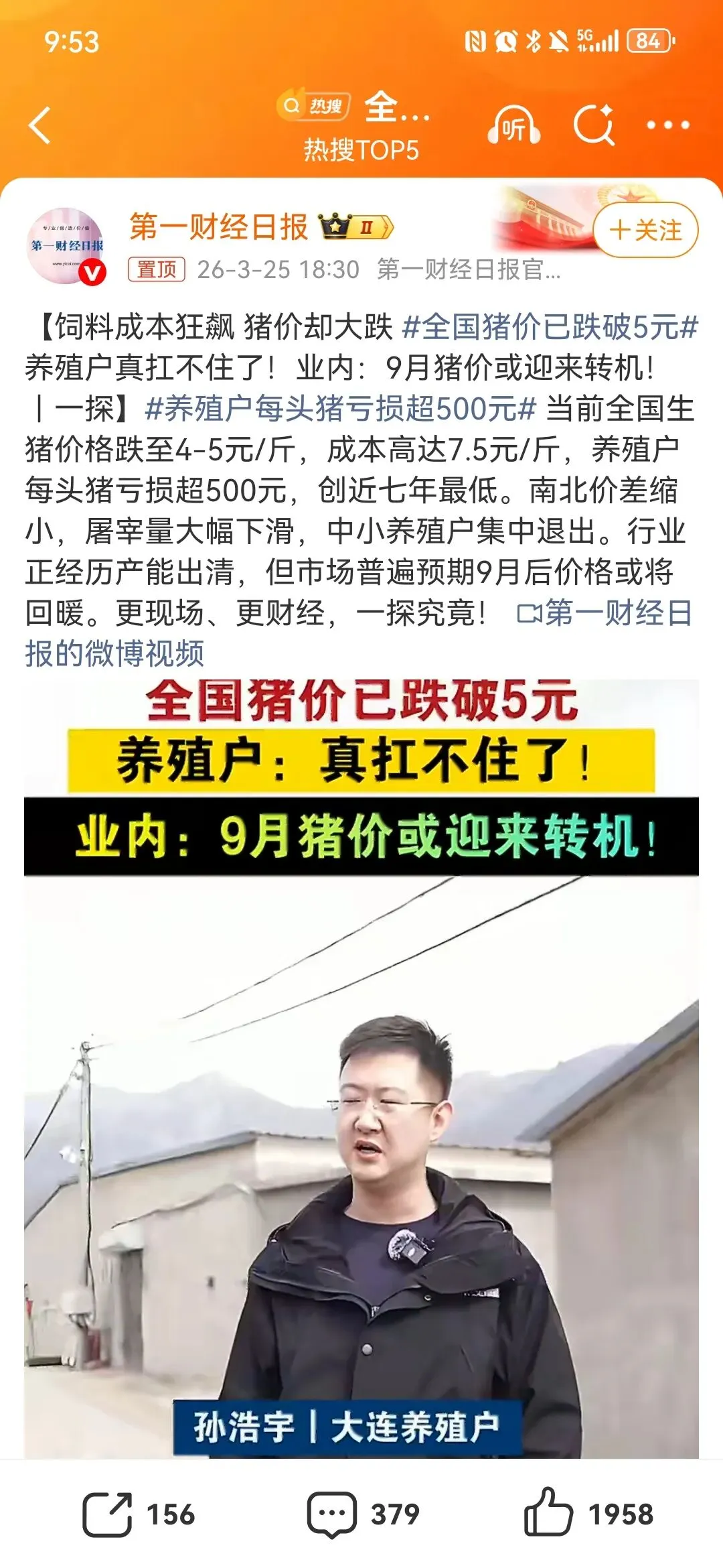 玉米、豆粕价格一路飙升,把养殖成本推到7.5元/斤,现在卖4-5元,卖一头亏一头,现金流直接被榨干。