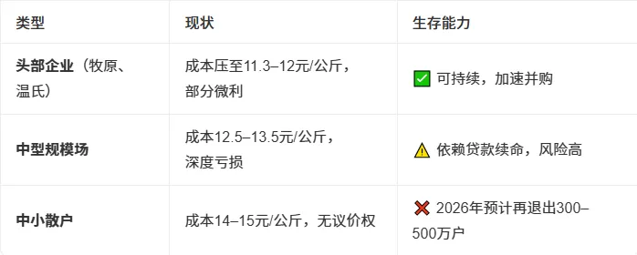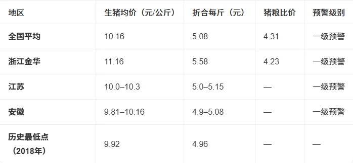 结果?:自繁自养成本线约?13元/公斤?,当前均价?10.16元/公斤?,?每头猪亏损260–300元?。