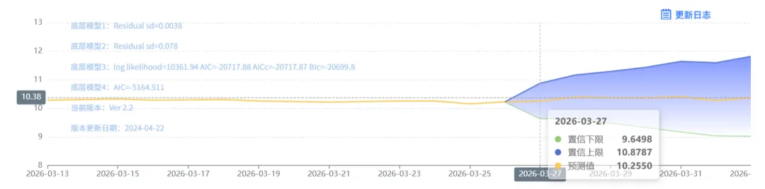 玄田算法是由项目课题组团队原创的非经典逻辑数值聚合理论和不确定性预测方法,构建了基于一致模算子的生猪价格预测模型。该模型采用的聚合函数及一致模相关理论与方法已获得多项国家自然科学基金和省级自然科学资金资助,并获得多项省级自然科学奖奖项。03月27日预测猪价为10.2550,置信区间在9.6498--10.8787之间。03月28日预测猪价为10.3970;03月29日预测猪价为10.3759。