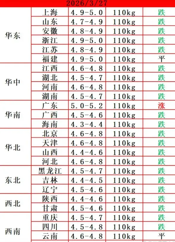 【柯恩·今日猪价】3月27日生猪价格 养羊网 2026-03-27 【柯恩·今日猪价】3月27日生猪价格全国统一咨询热线:4001-116-116需要饲料请拨打订货热线赣州:0797-8462111南昌:0791-85776699漳州:0596-6831299常德:0736-5696855茂名:0668-7303717 养羊网 2026-03-27 上一篇:2026年3月28日全国猪价最新走势 下一篇:猪价大跌不止!2026年3月27日全国猪价全线走弱,仅有两个地区逆势迎来涨价潮 您可能还会对下面的文章感兴趣111: 相关文章 2月10日成都鸡蛋价格参考 被小羊治愈了 自律期朋友绝对不能错过的超鲜鸡蛋 【猪价大预测】3月4日~3月6日!全国猪价!