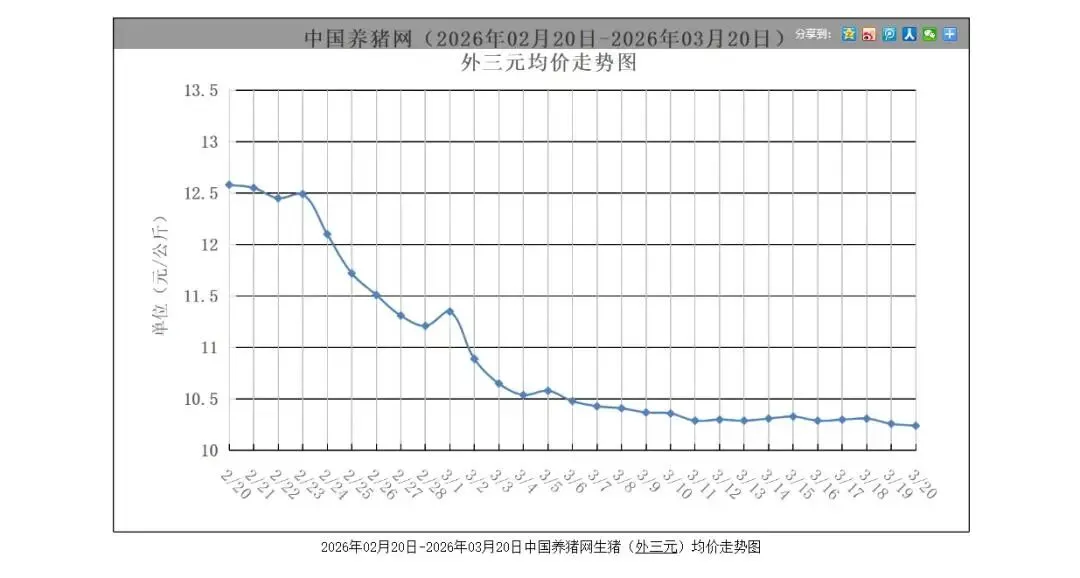 中国养猪网监测数据显示,截至3月25日,全国外三元生猪出栏均价已经跌至10.16元/公斤,即将跌破10元/公斤的心理支撑价位,创下2019年以来7年新低,距离2018年5月9.92元/公斤的历史最低值,相差不到3毛钱。
