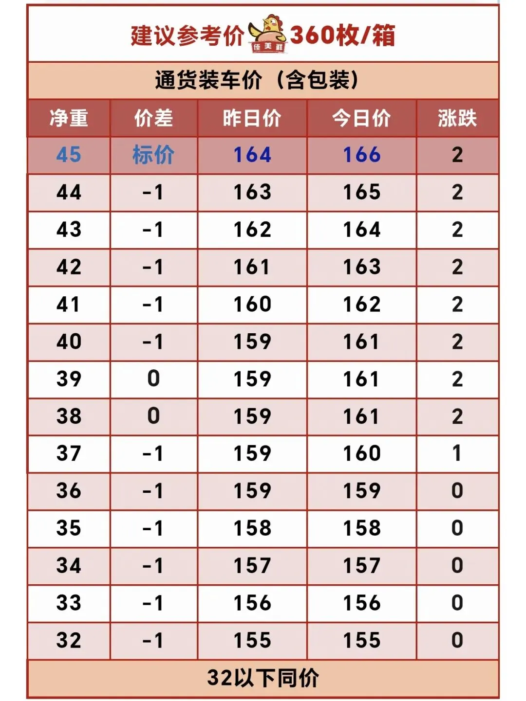 8.?湖北浠水粉蛋价格涨4,45斤粉蛋含箱蛋点收购165元每箱,45-43斤,轻1斤减2元每箱,42斤159元涨4,42-38斤,轻1斤减2元每箱,38-33轻1斤,减3元每箱,360枚纸箱装。