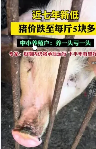 猪价跌至每斤5块多 近七年新低随着猪肉价格下跌和饲料成本上涨,中小农户面临着持续亏损的风险.