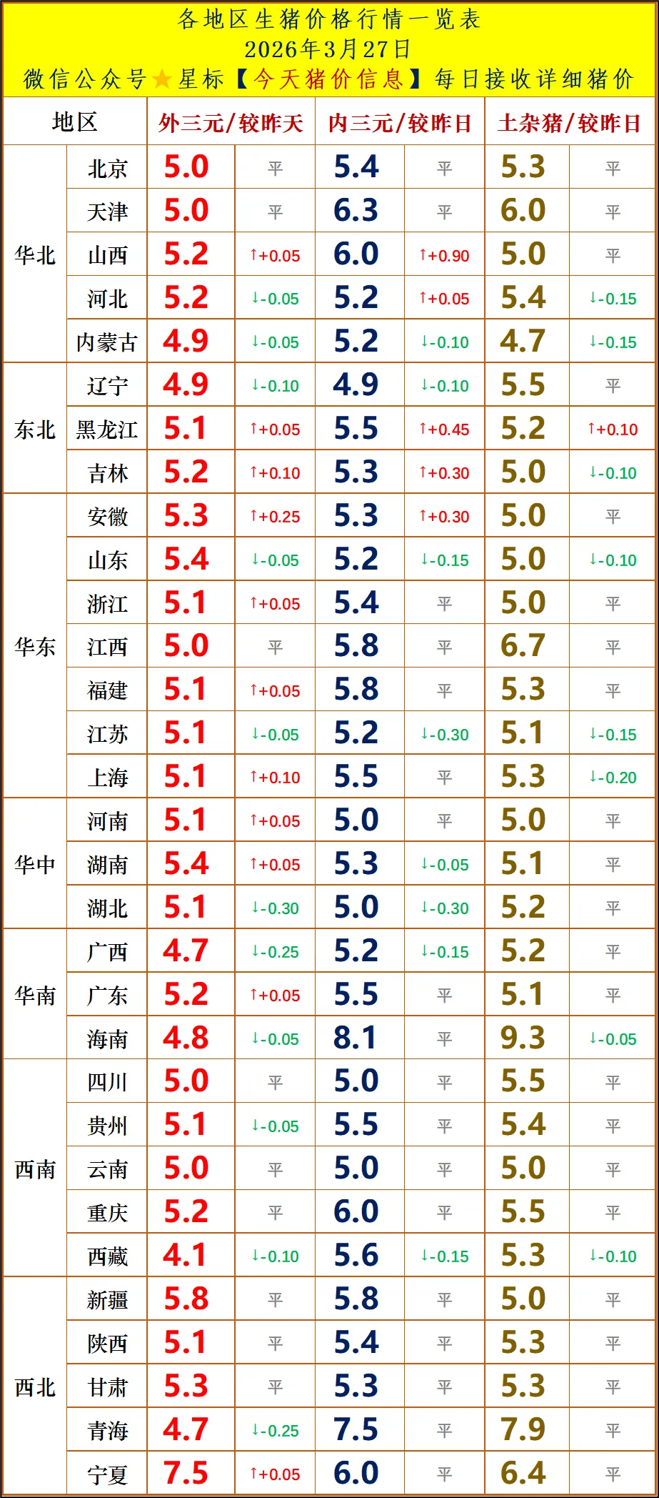 今日猪价 | 2026.3.28明天猪价行情分析!2026年03月27日猪价行情: 外三元:5.08元/斤,较昨日下跌0.03元 内三元:5.14元/斤,较昨日下跌0.08元 土杂猪:5.11元/斤,较昨日下跌0.04元