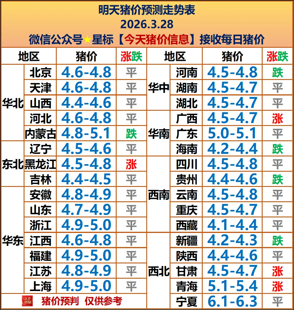 明天3月28日全国猪价跌势收窄、低位僵持,主流价约4.4-5.2元/斤。短期难有明显反弹,整体维持弱稳格局。4月猪价难有趋势性转折,整体以低位筑底、窄幅震荡为主。真正拐点大概率延后至5-6月,4月以稳为主、偏弱运行。