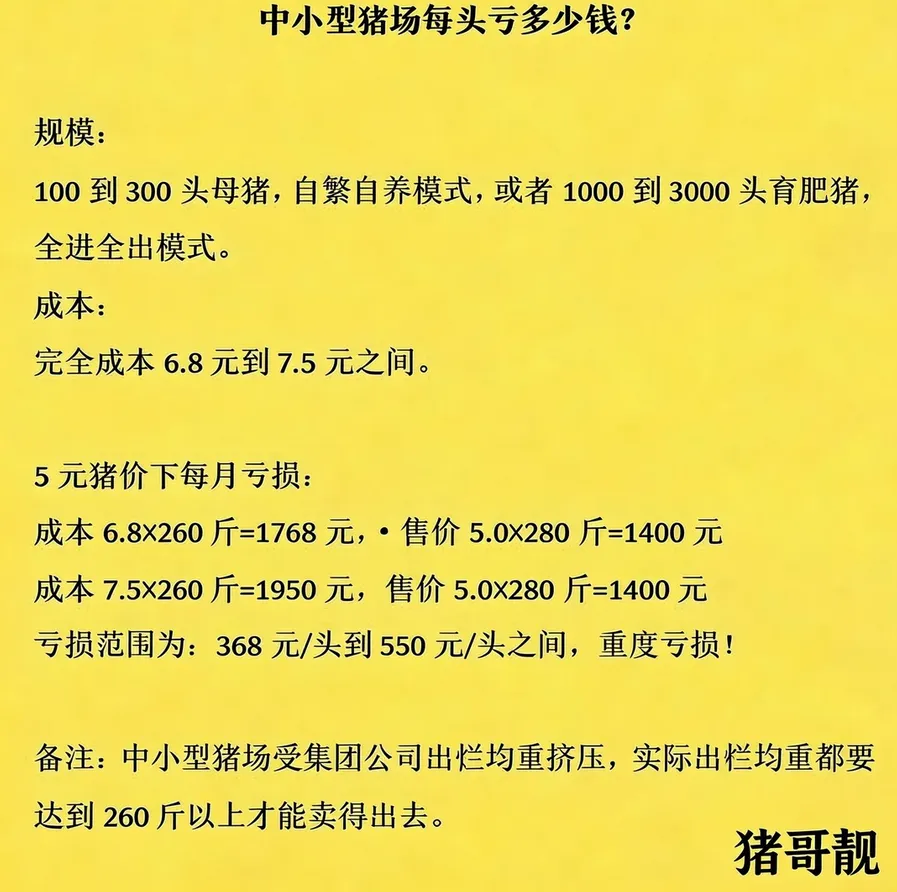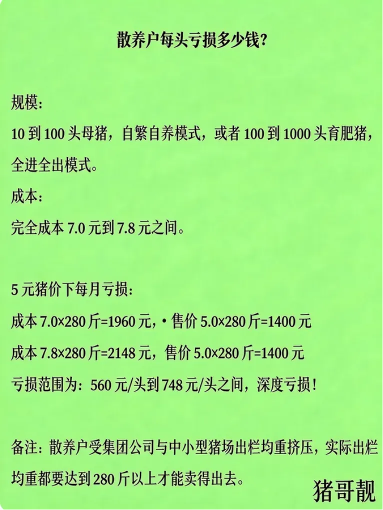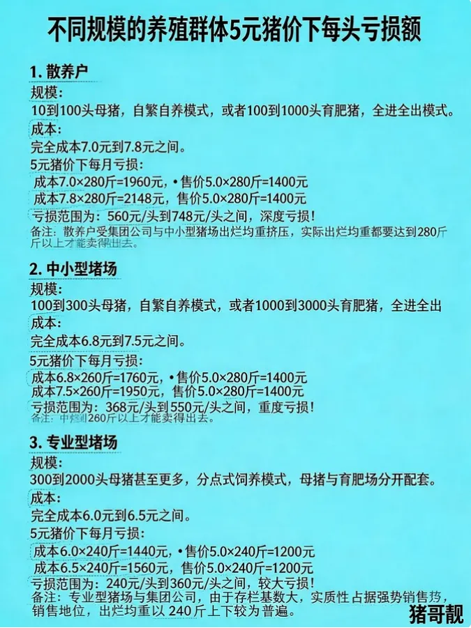 近日,一份由行业自媒体“猪哥靓”整理的《不同规模与类型的猪场每头猪出栏真实亏损分析》在圈内流传,数据直观地揭示了在当前5元猪价下,从散养户到专业猪场,每卖出一头猪所要承受的真实亏损额。