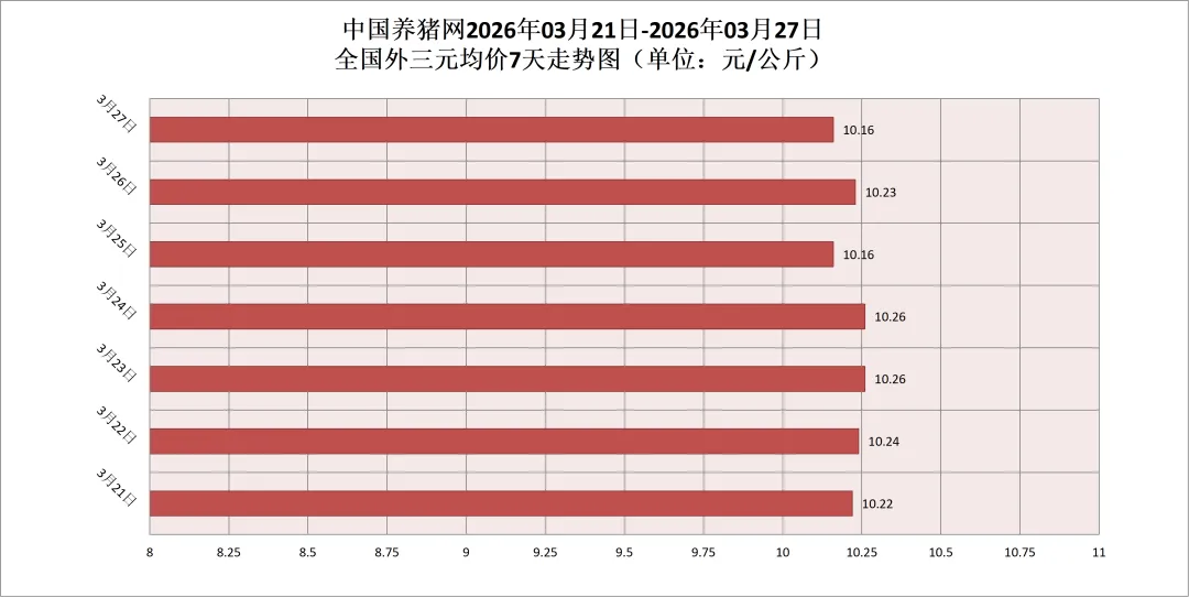 2026年03月27日(星期五),据中国养猪网猪价系统监测,全国外三元均价为10.16元/公斤,猪价较昨日(10.23元/公斤)下跌0.07元/公斤,较上月(11.31元/公斤)下跌了1.15元/公斤。