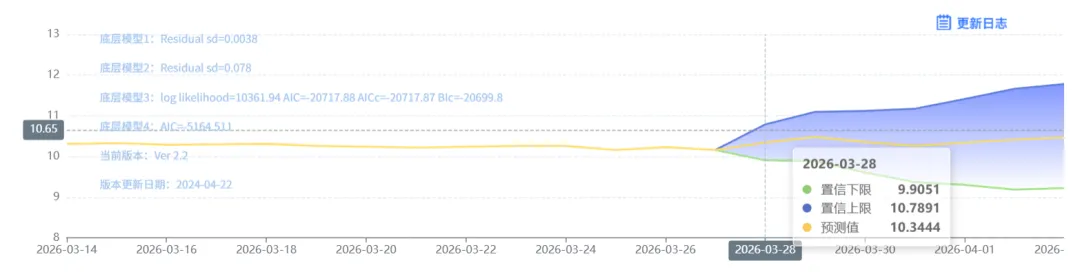 玄田算法是由项目课题组团队原创的非经典逻辑数值聚合理论和不确定性预测方法,构建了基于一致模算子的生猪价格预测模型。该模型采用的聚合函数及一致模相关理论与方法已获得多项国家自然科学基金和省级自然科学资金资助,并获得多项省级自然科学奖奖项。03月28日预测猪价为10.3444,置信区间在9.9051--10.7891之间。03月29日预测猪价为10.4808;03月30日预测猪价为10.3568。