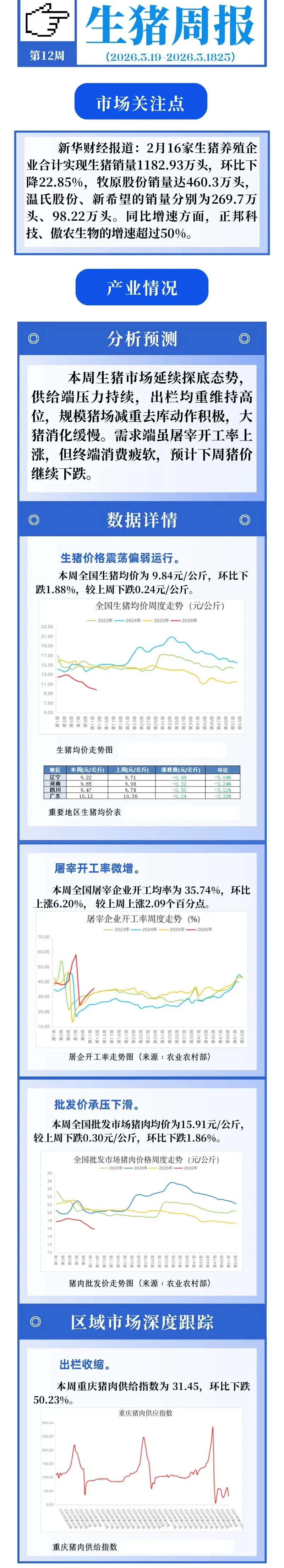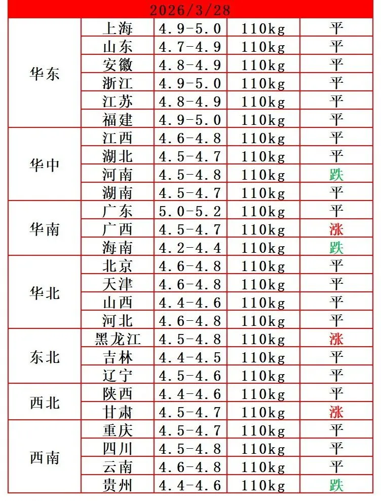 据“2026年03月27日(外三元)均价涨跌表”发现,今日生猪均价报10.16元/公斤,较昨日小幅下跌0.07元/公斤。昨日价格短暂回温后,今日再度走弱。官方明确年内母猪存栏需压减至3650万头,产能去化压力持续;同时表态不鼓励二次育肥,进一步抑制了市场抄底意愿。当前二育及屠企分割入库仅零星入场,标猪承接能力偏弱。供需基本面宽松叠加政策调控,养殖端出栏积极,中大猪供应明显增加,产能过剩格局凸显,猪价重心不断承压下行。从当前形势来看,短期内猪价偏弱趋势难改。