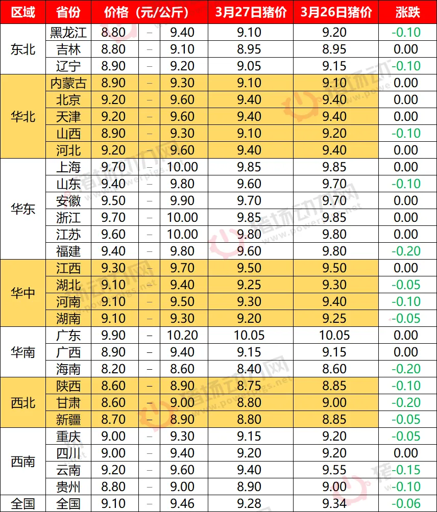3月27日全国猪价西北、华中主跌【动力猪价】