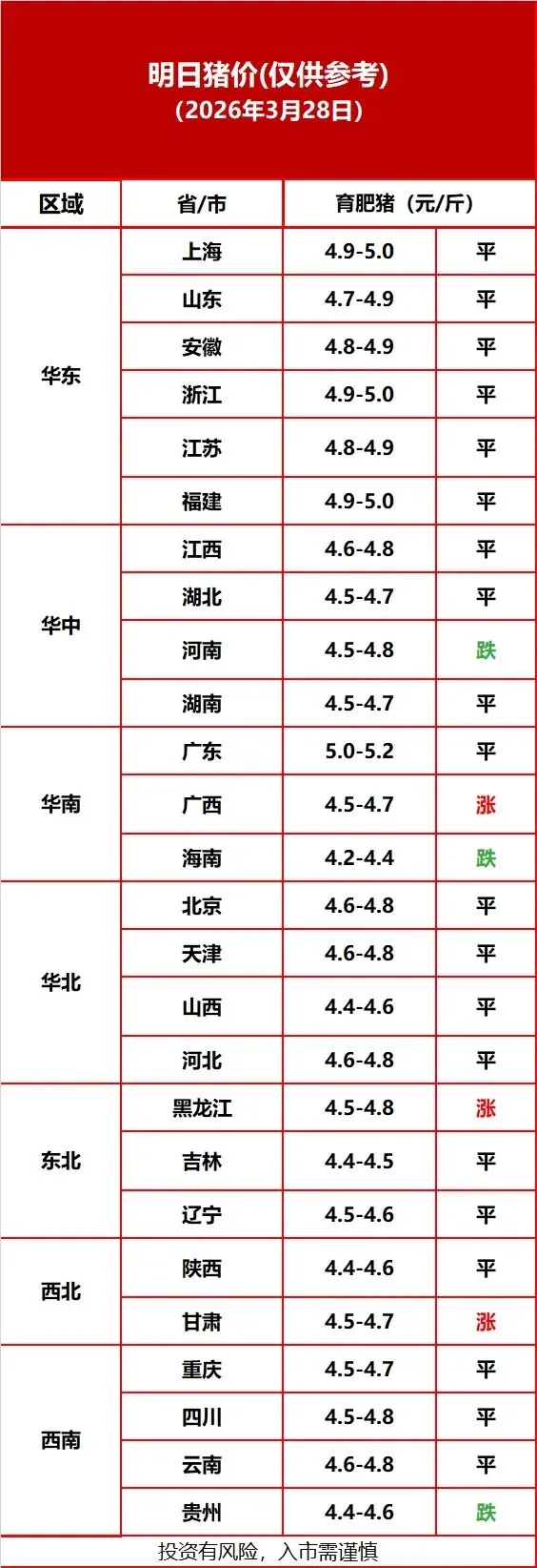 【今日猪价】3月28日全国猪价:整体跌势收窄、区域分化明显,局部微跌微涨 养羊网 2026-03-28 【今日猪价】3月28日全国猪价:整体跌势收窄、区域分化明显,局部微跌微涨 养羊网 2026-03-28 上一篇:2026年3月27日正大湖南鸡蛋价格行情 下一篇:猪价跌破5块钱,“菜比肉贵”还会持续多久? 您可能还会对下面的文章感兴趣111: 相关文章 一拖二旅居陵水,英州镇赶集真的让我挺失望… 2025年4月13日全国各地生猪价格信息 明日猪价|2026-02-05全国最新猪价(猪价已更新!) 今日鸡蛋价格早报【1月26日】
