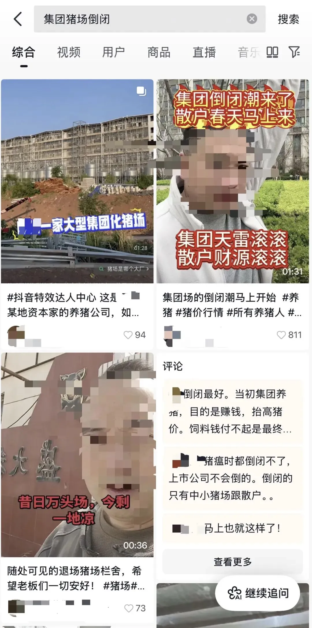 在某平台搜索“集团猪场倒闭”的结果 图片来源:记者截图