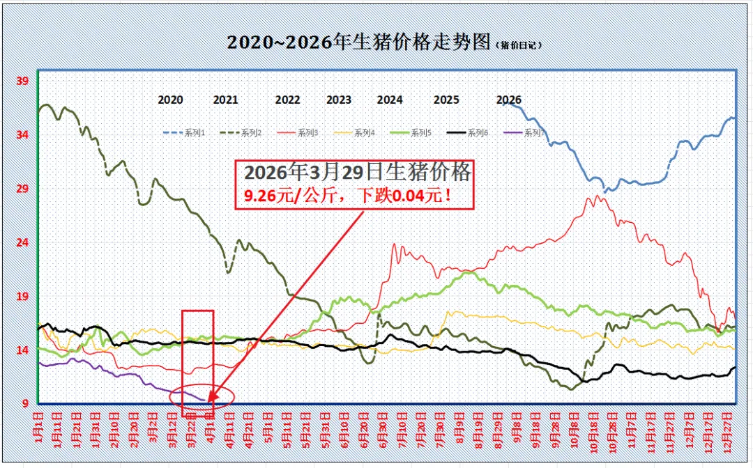 2026.3.29-明天猪价(一夜升温,猪价上涨“猛抬头”!)时光荏苒,3月即将收官,近期,国内生猪市场,碍于供需格局基本面偏空,猪价呈现史诗级下降的局面,外三元标猪报价触底9.3元/公斤,猪价再次刷新2019年近7年以来新低!虽然,猪价重心回落,这刺激二育以及屠宰场入场抄底,但是,相比供应增量,需求跟进略显不足,猪价在震荡中持续磨底,养殖户也持续忍受“钝刀割肉”的煎熬! 不过,在昨日生猪05合约方面,2605生猪报价触底9815元/吨历史低位后,报价呈现一定逆势上涨的走势,最终报价确定在9965元/吨,市场情绪略有改善! 而在生猪购销方面,目前,市场多空并存,猪价或进入“黎明前的黑暗”时刻,猪价或难有进一步大降的基础! 利空因素:一方面,猪肉购销处于季节性淡季,鲜品猪肉购销冷清,主流屠宰场白条出货不畅,鲜品销率下降,内销以及城市需求缺乏增量,居民替代消费普遍,饮食格局倾向于清淡;另一方面,生猪供应压力不减,按照母猪存栏以及PSY数值推测,3月标猪供应大幅增加,且,气温持续回暖,生猪增重加快,进一步增加标猪供应压力!而饲料成本偏高,标猪与肥猪缺乏价差,标猪压栏成本压力加剧,养殖端谨慎压栏,散户以及集团猪企被动出栏增多,供应格局宽松! 利好因素:一方面,生猪报价走弱,标猪触底9.3元/公斤,养殖端扛价情绪转强,部分散户有挺价心态;另一方面,市场抄底现象有所增加,尤其是,本周,屠宰场冷冻猪肉库存增加,环比上周增加2.8个百分点,部分屠宰场逢低入场,分割猪肉入库增加。且,当前二育空栏较多,二育仍有逢低入场的现象,市场底部支撑略有转强! 由此来看,在供需调整下,市场多空并存,但是,碍于中上旬供应压力大于需求表现,猪价以持续寻底为主!而随着猪价重心下移,3月即将收官,市场底部支撑或逐步转强,猪价或有止跌回暖的机会!但是,碍于10个月前母猪存栏处于高位,且,母猪PSY数值大幅提升,生猪供应压力存在,这或将抑制后市回暖的空间! 据最新数据显示,受供需变化,预计,3月29日,外三元瘦肉型标猪价格,出栏均价在9.26元/公斤,南北市场以盘整震荡为主,后市关注下游市场购销节奏的变化!