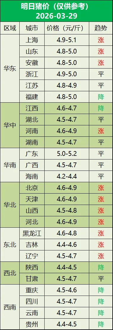 明日猪价(2026年03月29日) 养羊网 2026-03-28 明日猪价(2026年03月29日) 养羊网 2026-03-28 上一篇:同样养羊,有人赚有人亏,差距根本不在品种! 下一篇:猪价丨3月29日 明日猪价早知道 您可能还会对下面的文章感兴趣111: 相关文章 又领了一些鸡蛋? 近期价格更新!!! 藏族人真的有钱吗? 浙江湖州·NUAGE TANCH云朵农场的魅力与特色