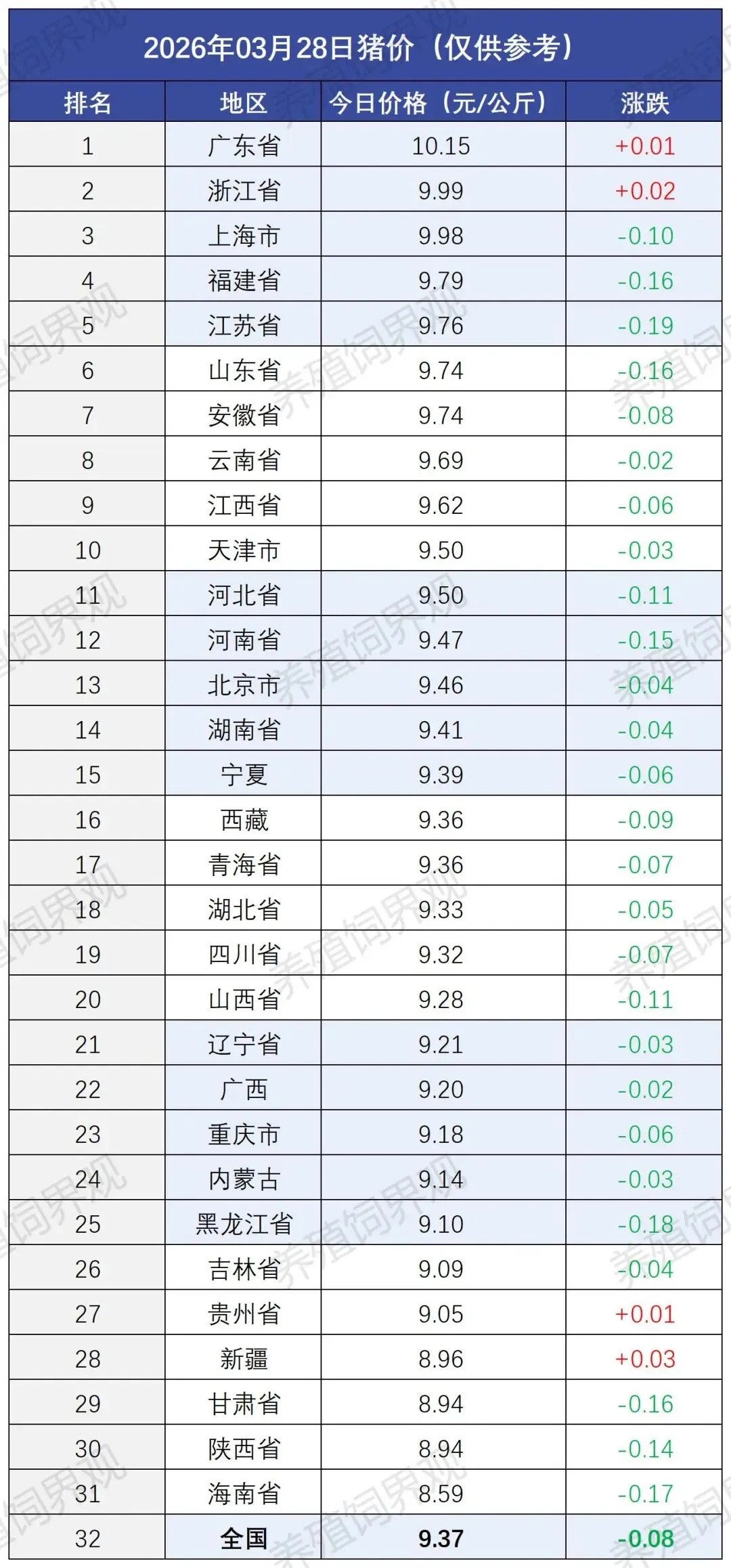 数据显示,3月28日,全国外三元生猪平均价格为9.37元/公斤,较昨日下跌0.08元/公斤。