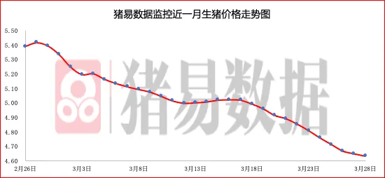 据猪易数据监测数据显示,2026年3月28日标准体重生猪平均价格为9.26元/公斤,较昨日猪价下跌0.04元/公斤,跌幅为0.43%,同比25年同期14.54元/公斤下跌5.28元/公斤,跌幅为36.31%。